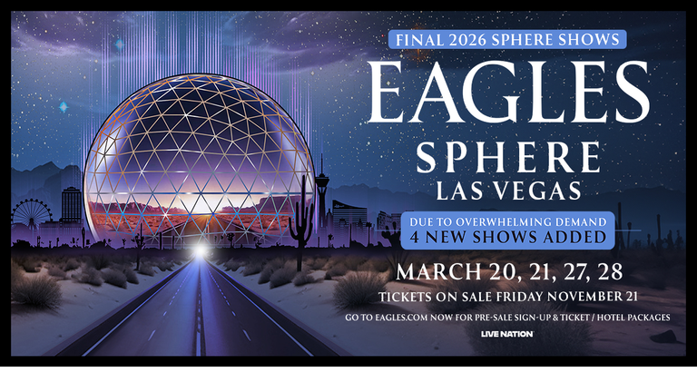 The Eagles have added the final 2026 Sphere shows to the band’s residency at Sphere in Las Vegas on Fri, March 20, Sat, March 21, Fri, March 27, and Sat, March 28. The residency now features a total of 56 shows from Fri, Sept. 20, 2024, through Sat, March 28, 2026. Presale signup starts now. The presale begins Wed, November 19 at 10am PT. Vibee VIP Packages are onsale Tuesday, November 11 at 10 AM PT. The general on-sale for the new shows will begin on Fri, November 21 at 10am PT here: https://eagles.com/