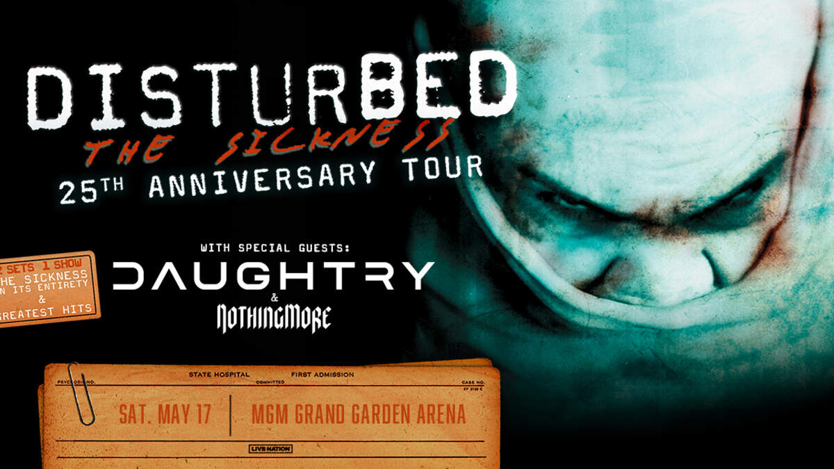On May 17th, 2025 Disturbed will be performing their The Sickness 25th Anniversary Tour at MGM Grand Garden Arena with Daughtry & Nothing More. Tickets go on sale on October 18th at 10AM PST.