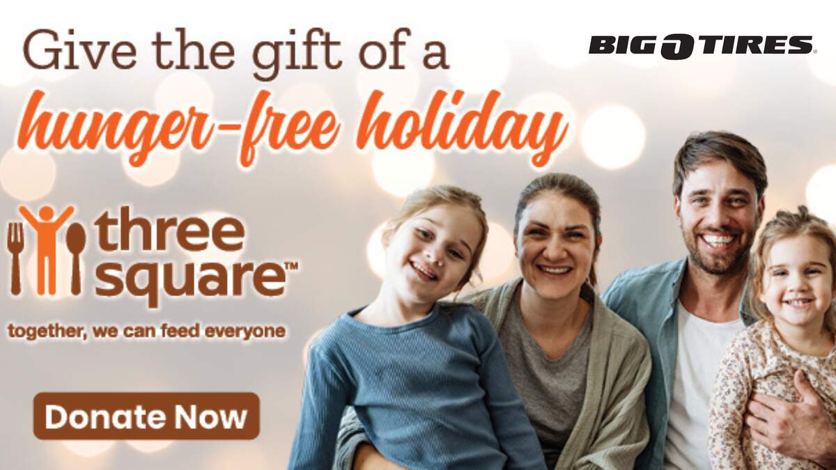 Join us today at Big O Tires from 3 to 5 on November 26th, December 3rd, December 10th, and December 17th for Three Square’s Hunger-Free Holiday! Donate in person and get 50% off any oil change, or buy three tires, get one free. Give the gift of food this season—just one dollar provides up to six meals. Join us and make a difference! See below for exact dates and addresses.