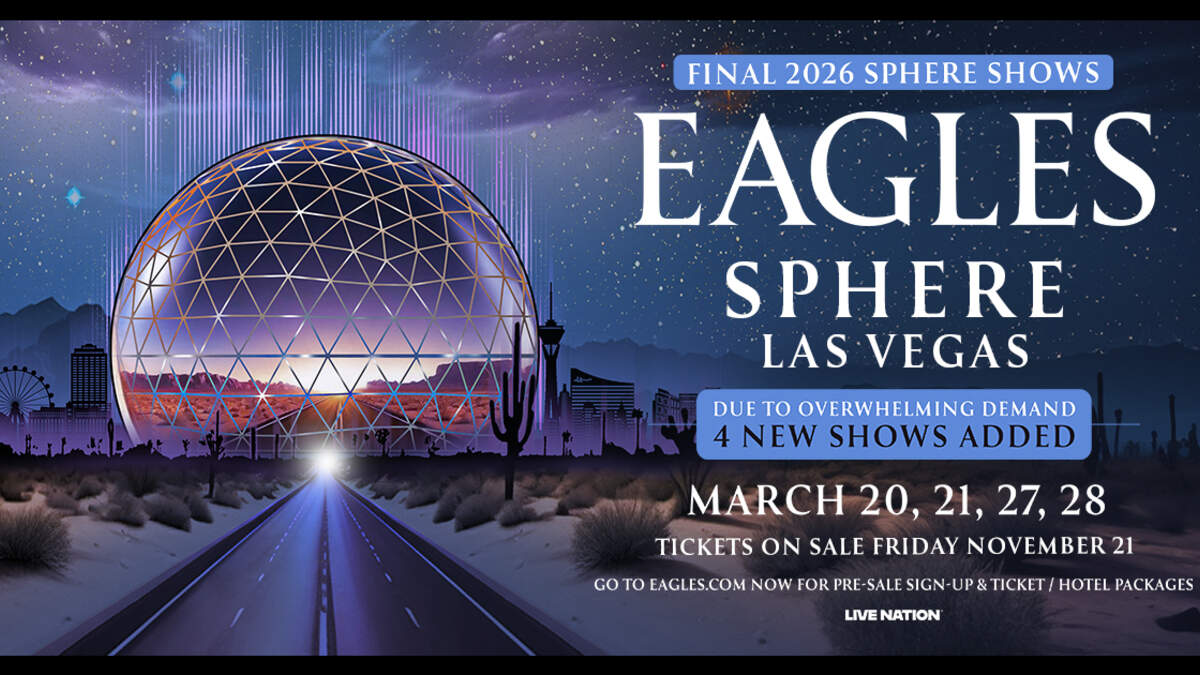 The Eagles have added the final 2026 Sphere shows to the band’s residency at Sphere in Las Vegas on Fri, March 20, Sat, March 21, Fri, March 27, and Sat, March 28. The residency now features a total of 56 shows from Fri, Sept. 20, 2024, through Sat, March 28, 2026. Presale signup starts now. The presale begins Wed, November 19 at 10am PT. Vibee VIP Packages are onsale Tuesday, November 11 at 10 AM PT. The general on-sale for the new shows will begin on Fri, November 21 at 10am PT here: https://eagles.com/